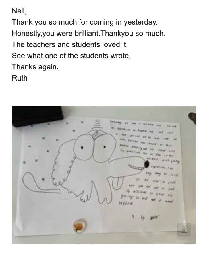 The cartoon session was going well, lots of silly cartoons and smiling faces. But I noticed one girl laying head in arms on the table, a little older than the others, with noticeable signs of self harm. She ignored me, the staff explained that she’s always like this, and not to take it personally, so I continued around the table showing the kids how to draw whatever silliness they requested.